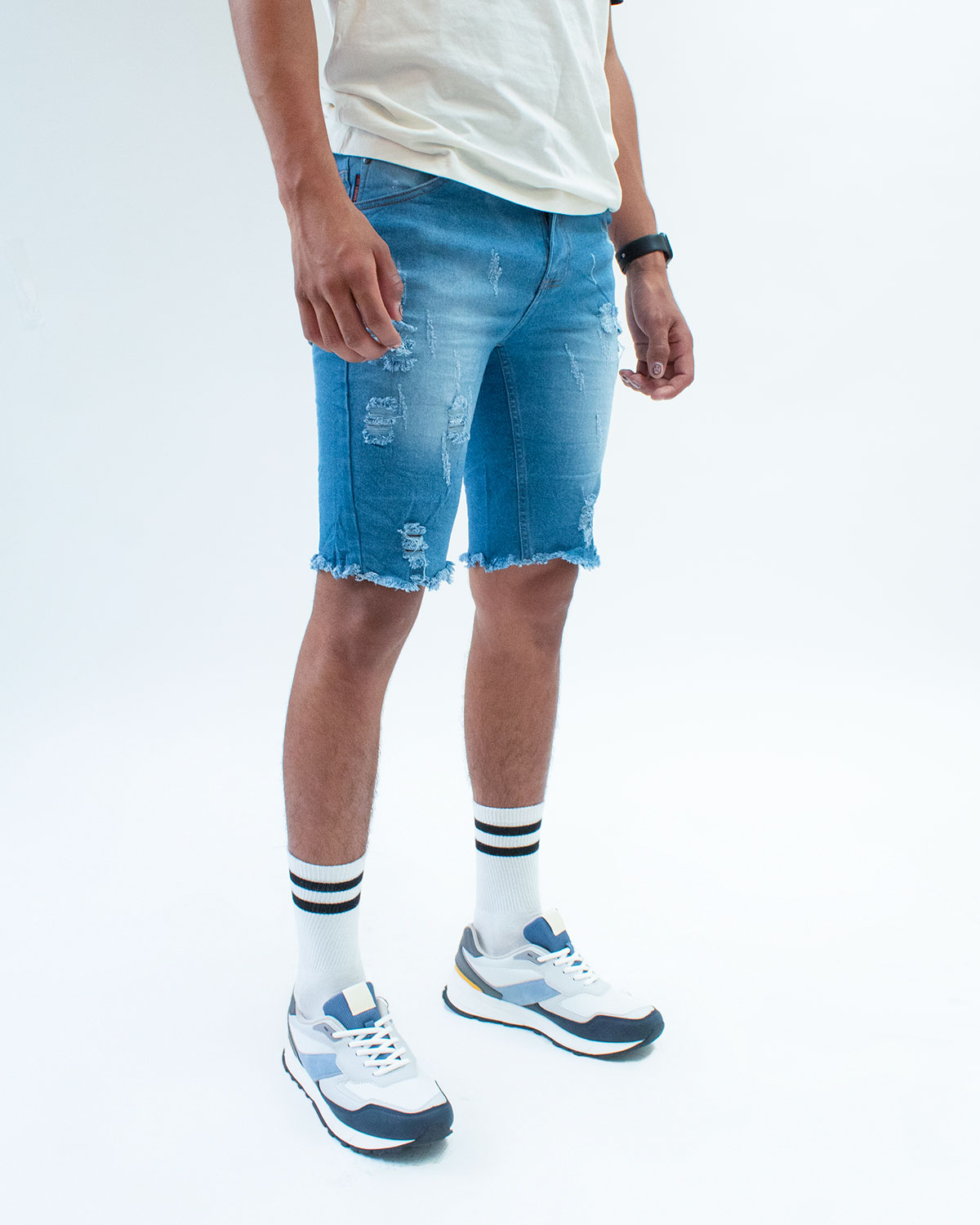 Bermudas Denim Hombre: Comodidad y Estilo Colombiano Confeccionadas en Colombia con una mezcla de algodón y poliéster, nuestras bermudas denim te ofrecen la máxima comodidad y un estilo único. Su diseño y efectos Destroyer las convierte en una prenda versátil y a la moda.